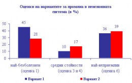 Председателят на Българска търговско-промишлена палата Цветан Симеонов и директорът на Икономически анализи и политика в БТПП Александър Димитров представиха обобщени резултати от анкетно проучване на БТПП за предлаганите изменения в пенсионната система. РЕЗУЛТАТИ ОТ АНКЕТНО ПРОУЧВАНЕ на БТПП Изменения в пенсионната система - 45% смятат, че този вариант в най-безболезнен (оценка 1); - 73% одобряват това съотношение 1. Разбирайки проблемите в осигурителната система, ръководителите на фирмите подкрепят увеличаването на осигурителния стаж като мярка за преодоляване на дефицита. 2. Голямата социална значимост, обществените дискусии по темата и многовариантността на мерки доведоха до разнопосочност на отговорите и разпръскване на резултатите. Въпреки това може да се обобщи: