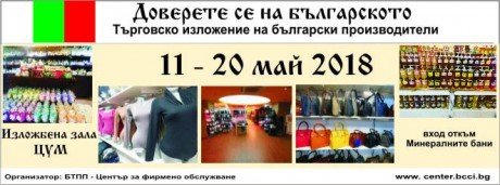 Българска търговско-промишлена палата има удоволствието да Ви информира, че дванайсетото издание на търговско изложение „ДОВЕРЕТЕ СЕ НА БЪЛГАРСКОТО” ще се проведе от 11 до 20 май 2018 г. в Изложбена зала ЦУМ.