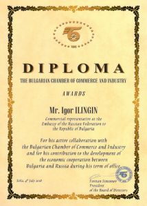 The President of BCCI Tsvetan Simeonov presented Igor Ilingin, Commercial representative at the Embassy of the Russian Federation to the Republic of Bulgaria, with an Honorary Diploma for his contribution to the development of the economic cooperation between Bulgaria and Russia and his active collaboration with the Bulgarian Chamber of Commerce and Industry during his term of office in the country.