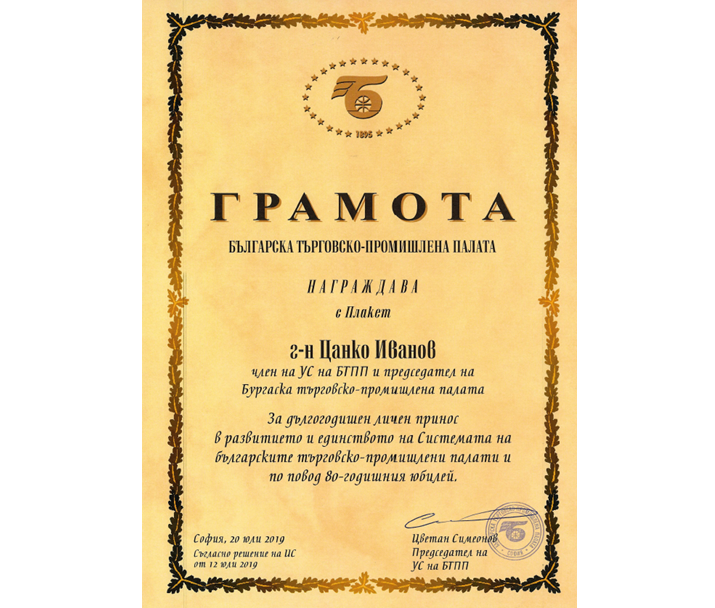 Изпълнителният съвет на Българската търговско-промишлена палата удостои с плакет и грамота дългогодишният председател на Бургаската търговско-промишлена палата Цанко Иванов. Отличието на БТПП е за значителен личен принос към единната система на търговско-промишлените палати и по повод неговия 80-годишен юбилей.