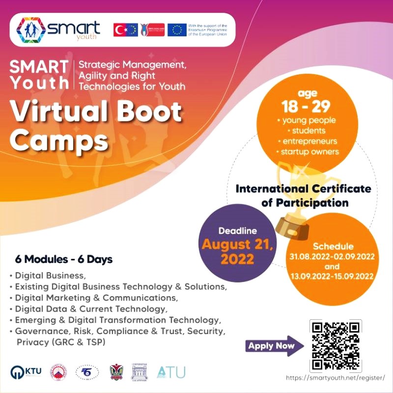 Обучението, което се организира в рамките на изпълнявания с участието на БТПП проект Smart Youth (Strategic Management, Agility and Right Technologies for Youth)*, е предназначено за младежи и студенти с интерес в предприемачеството, начинаещи предприемачи и собственици на стартиращи компании, като изискването към участниците е да са на възраст между 18 и 29 г.
