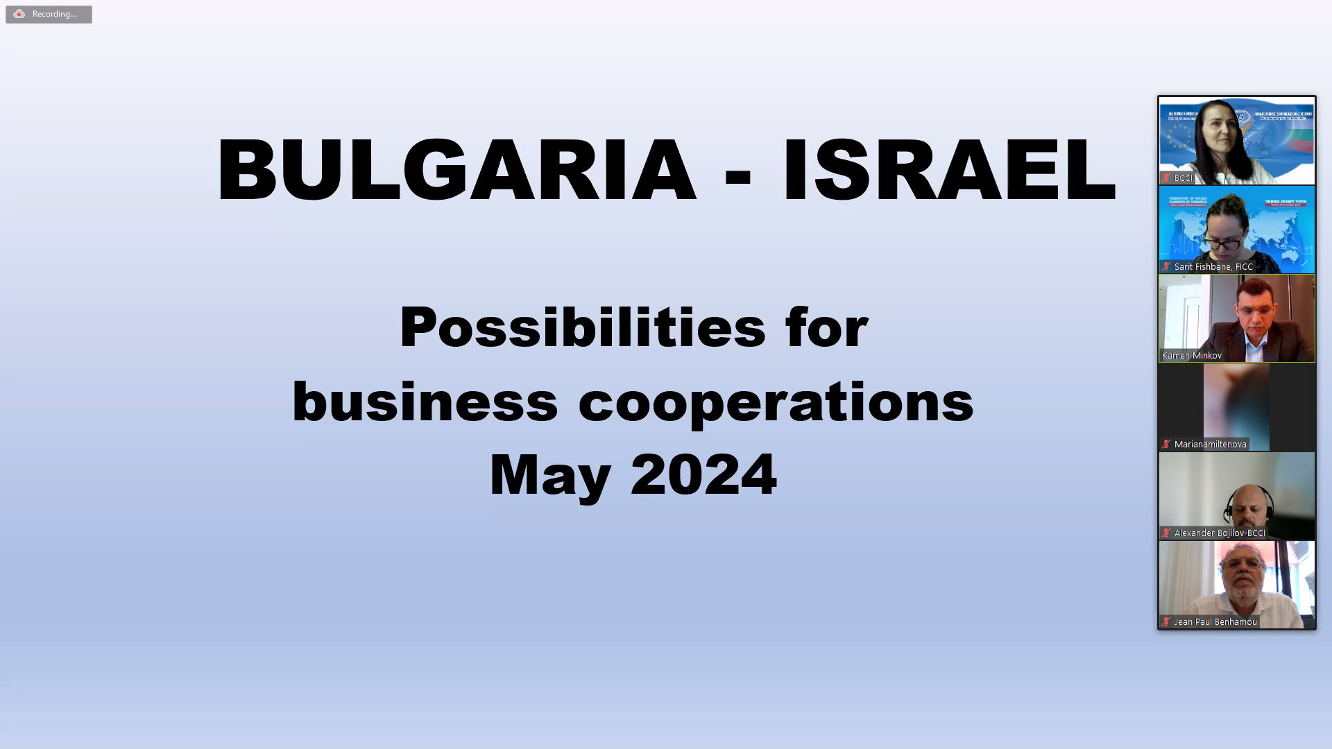 Българската търговско-промишлена палата, съвместно с Търговската служба към Посолството на България в Израел и Федерацията на израелските търговско-промишлени палати, проведе онлайн среща на тема „България–Израел: възможности за бизнес сътрудничество“. Целта бе да се представят възможностите за търговия, внос и износ между двете страни, с акцент условията за внос в Израел, както и производствения и експортен потенциал на конкретни сектори в България.