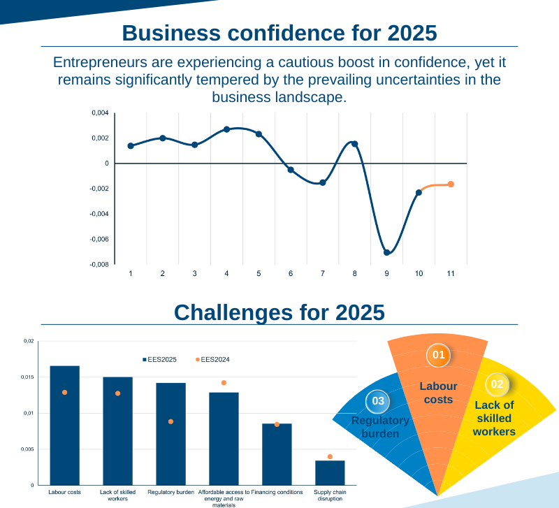 Очакванията за бизнес доверие за 2025 г. на европейските фирми (презентация тук) леко се подобряват в сравнение с предходната година, но все още са отрицателни. Резултатът отразява като цяло бурната икономическа перспектива и предпазливата реакция на европейския бизнес.