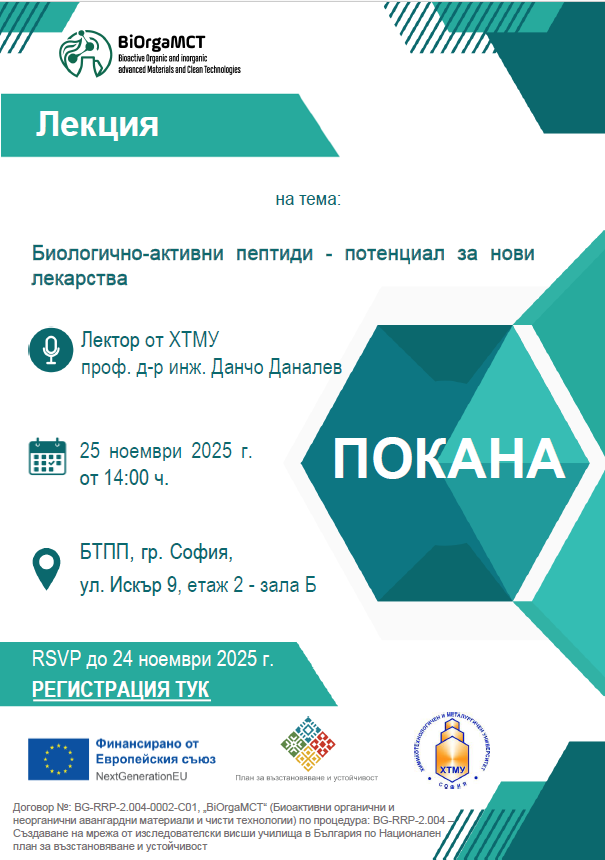 Българската търговско-промишлена палата и Химикотехнологичния и металургичен университет имат удоволствието да Ви поканят на бизнес дискусия на тема „Биологично-активни пептиди - потенциал за нови лекарства“.