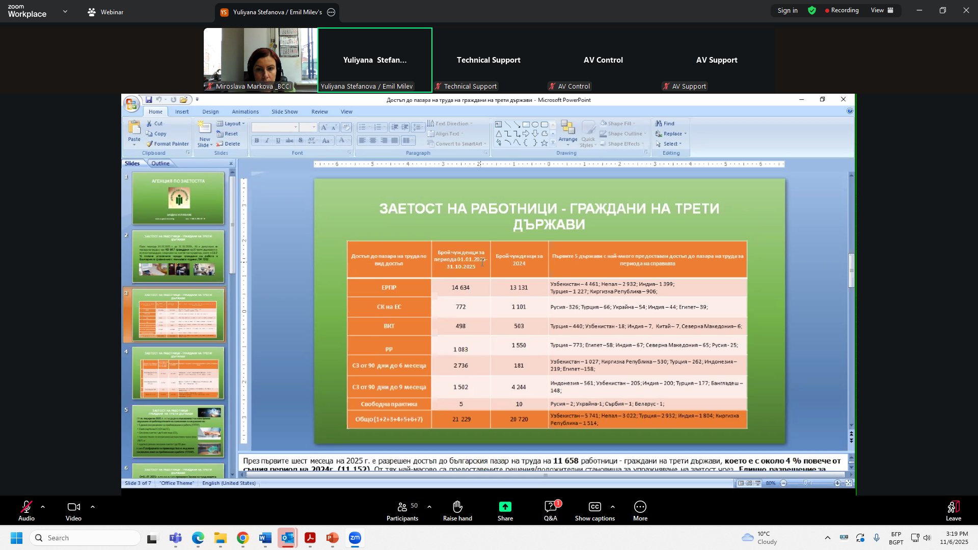 Юлияна Стефанова и Емил Милев, водещи експерти в дирекция „Разрешителни и трудова миграция“ към Агенцията по заетостта, споделиха, че от началото на годината Агенцията е допуснала на пазара на труда у нас над 40 000 граждани от 85 страни, което е със 117% повече, в сравнение с миналата година. Експертите предоставиха информация за броя на издадените разрешения и страните с най-много предоставен достъп до пазара на труда. Представена бе и възможността за електронно подаване от работодателите на заявление за издаване на единно разрешение за пребиваване и работа /ЕРПР/, Синя карта и сезонна заетост.