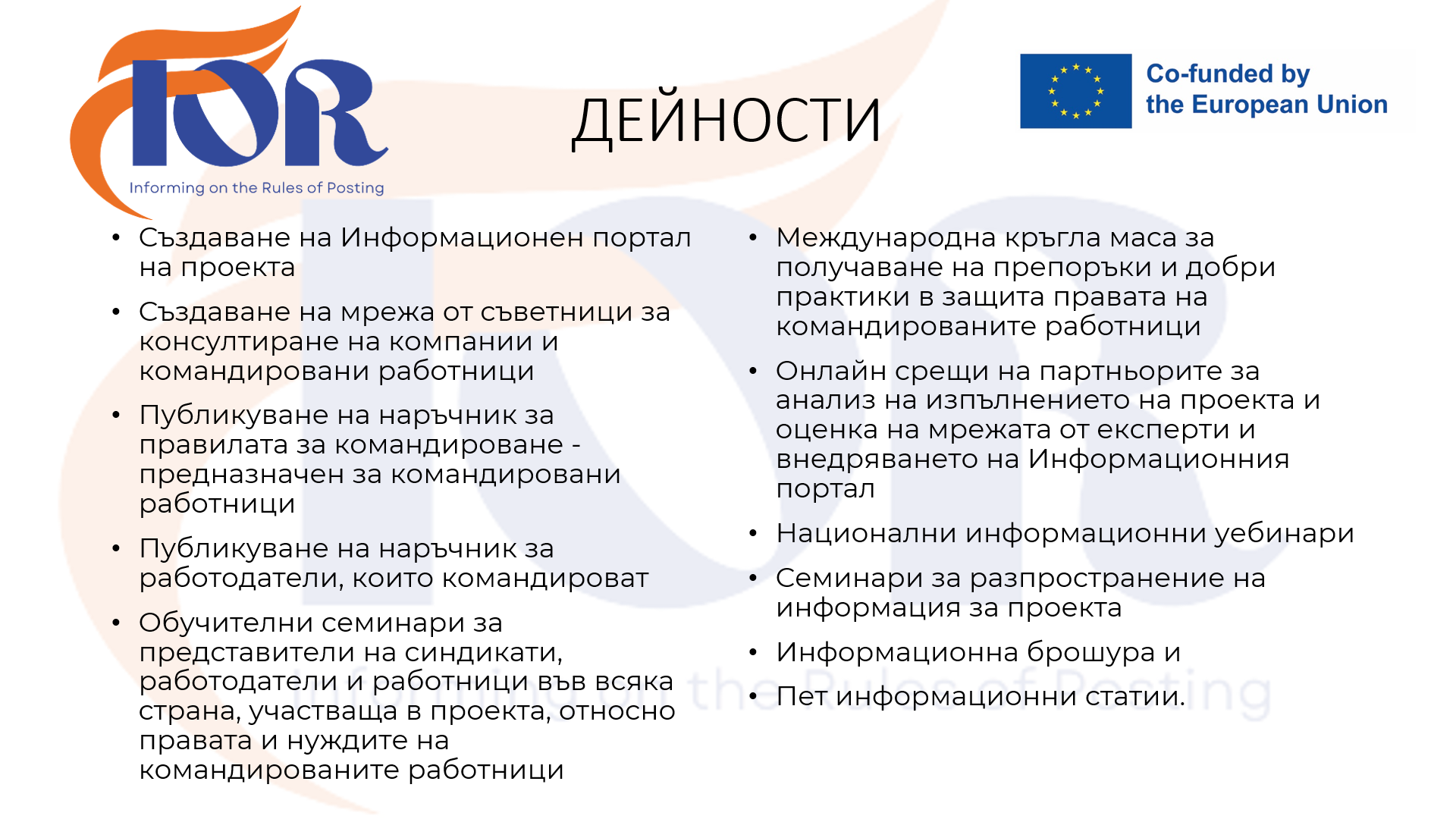 Основната цел на проекта е: да се повиши достъпността, прозрачността и качеството на информацията относно реда и условията на работа, при командироването на работници. Проектът засяга и темата за наемане на работници от трети страни.