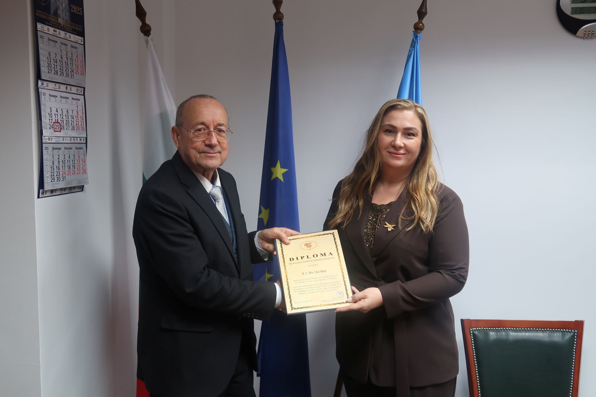 H.E. Ms Omar was honored for her active cooperation with BCCI, as well as for her contribution to the development of the economic relations between Bulgaria and Iraq. The Diploma was conferred by the President of the Chamber Mr Tsvetan Simeonov.