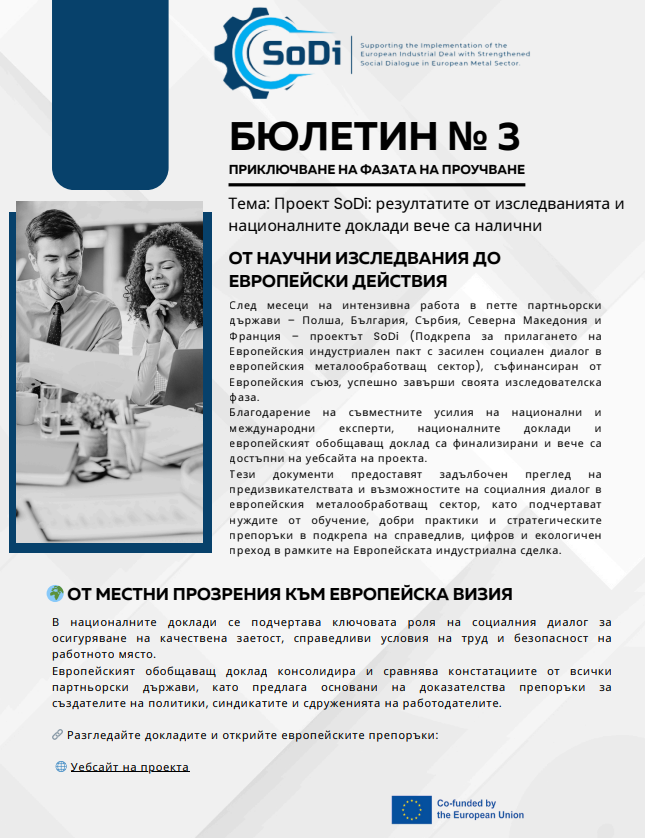 Българската търговско-промишлена палата, като партньор по европейския проект SoDi - Подкрепа за прилагането на Европейската индустриална сделка чрез засилен социален диалог в европейския металургичен сектор, информира, че резултатите от изследванията и националните доклади по проекта вече са налични.