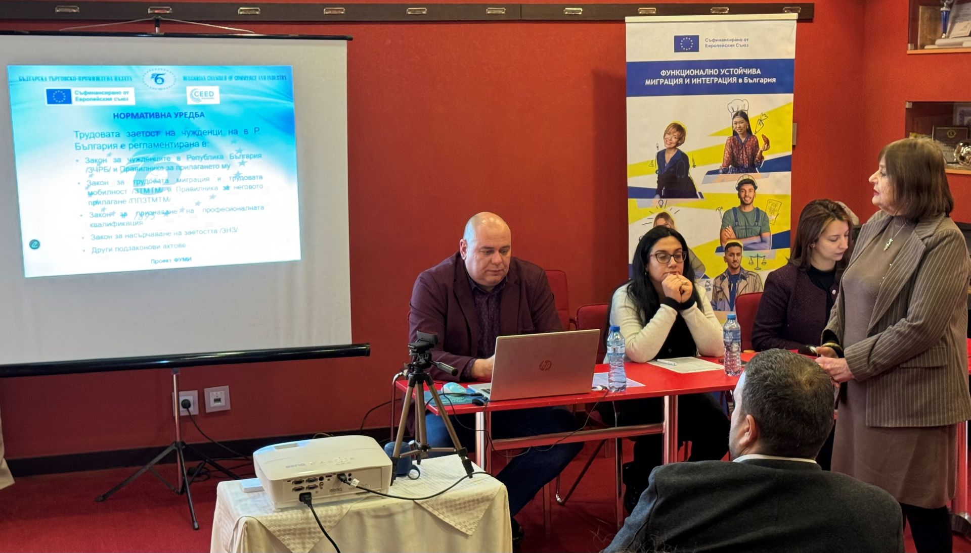Заместник изпълнителният директор на CEED България Станислав Червенков представи целите, дейностите и постигнатите резултати по проекта. Той запозна участниците с платформата за търсене и предлагане на работа за граждани от трети държави – www.bgjobsportal.com, разработена в рамките на проекта. Платформата позволява безплатна регистрация и директна комуникация между работодатели и кандидати. Червенков подчерта значението на привличането на качествен човешки капитал за устойчивото икономическо развитие. Той отбеляза, че проектът цели и подобряване на сътрудничеството и обмена на информация между България и страни извън ЕС, по-специално Молдова, Албания, Украйна, Армения и Виетнам.