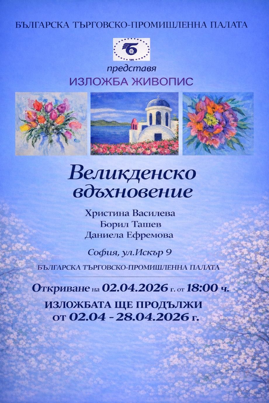 На 2 април от 18 часа във фоайето на БТПП ще можете да присъствате на официалното откриване на изложба живопис „Великденско вдъхновение“ на Христина Василева, Борил Ташев и Даниела Ефремова.