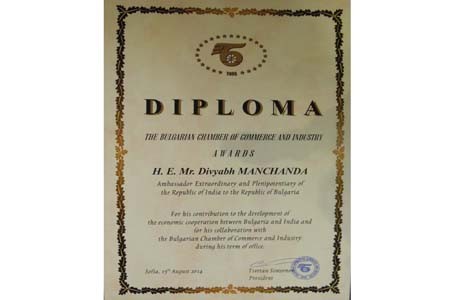 Извънредният и пълномощен и посланик на Индия в България – Н.Пр. Дивябх Манчанда бе удостоен с почетен диплом за съдействие при развитие на търговско - икономическите отношения между България и Индия и за активното му сътрудничество с Българската търговско-промишлена палата. Дипломът бе връчен от Васил Тодоров, главен секретар на Палатата.