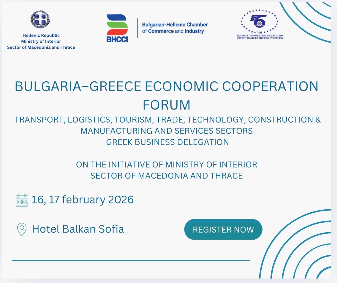 Българската търговско-промишлена палата има удоволствието да информира, че заедно с Българо-гръцката търговско-промишлена камара е партньор на предстоящия българо-гръцки бизнес форум, който ще се състои на 16 и 17 февруари 2026 г. в София Балкан Палас хотел от 10,00 ч.